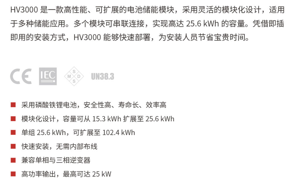 HV3000 是一款高性能、可扩展的电池储能模块,采用灵活的模块化设计,适用于多种储能应用。多个模块可串联连接,实现高达 25.6 kWh 的容量。凭借即插即用的安装方式,HV3000 能够快速部署,为安装人员节省宝贵时间。