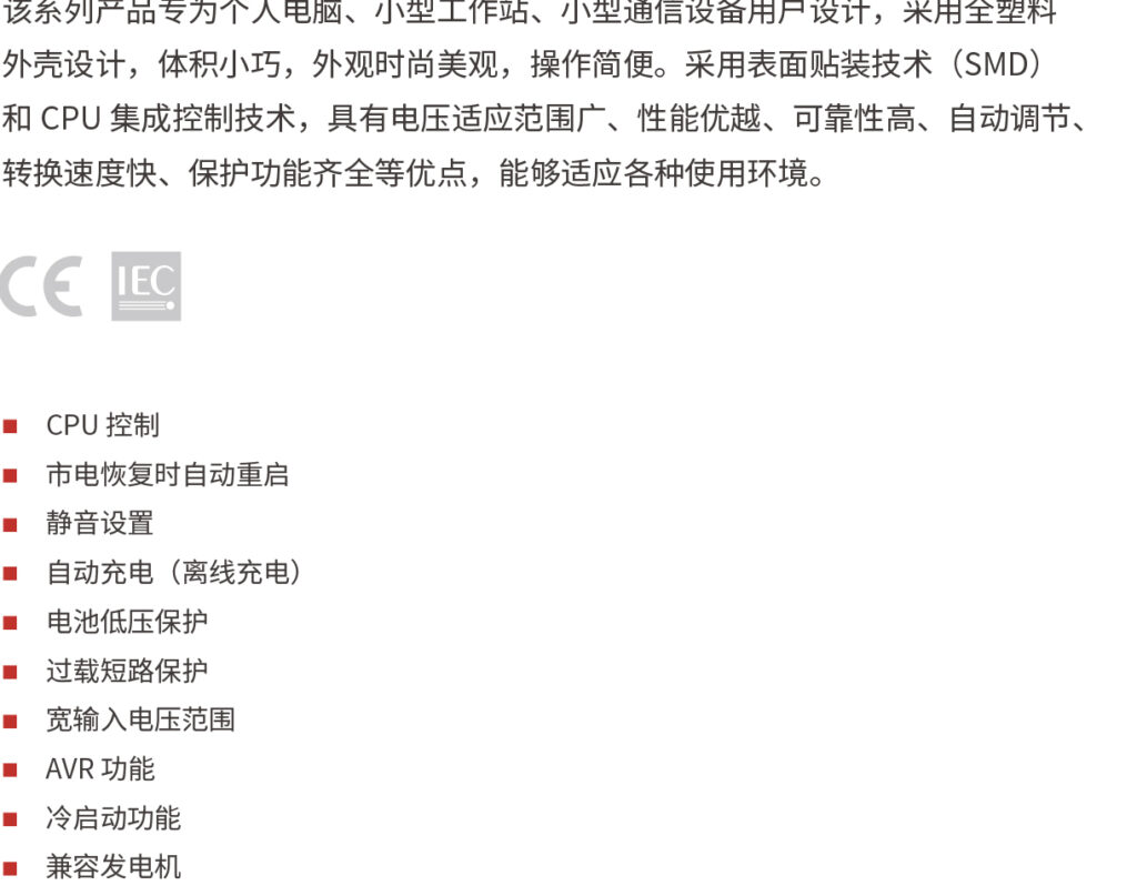 该系列产品专为个人电脑、小型工作站、小型通信设备用户设计,采用全塑料外壳设计,体积小巧,外观时尚美观,操作简便。采用表面贴装技术(SMD)和 CPU 集成控制技术,具有电压适应范围广、性能优越、可靠性高、自动调节、转换速度快、保护功能齐全等优点,能够适应各种使用环境。